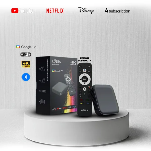 TV Box ذكي بنظام Google TV، كيدعم 4K بجودة عالية وريموت Bluetooth سهل الاستعمال. أداء سريع، اتصال WiFi مزدوج 2.4G/5G، وتشغيل سلس لجميع تطبيقات المشاهدة والترفيه في جهاز واحد أنيق.